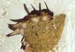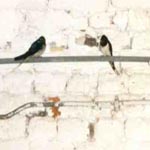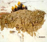 Het is een piepen van jewelste. De zwaluw op de leiding loopt een eindje over de leiding heen en weer, de zwaluw op de deur vliegt terug op het nest. Nu zit hij met de staart naar voren en z'n kopje naar binnen. Hij weet niet hoe hij zich moet omdraaien, zo vol is het in die kleine ruimte. Een interessant schouwspel om te zien, hoe hij weer met z'n snaveltje naar voren probeert te komen. Het lukt! |