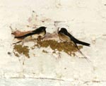 Twee boerenzwaluwen hebben onze achterdeur uitgekozen: in dat stalletje bouwen ze hun nest. Ze zijn niet bang voor ons, want we lopen er iedere dag een aantal keren in en uit en toch willen ze in geen andere stal hun jongen grootbrengen. Zwaluwen, je mag hier wonen! |