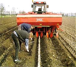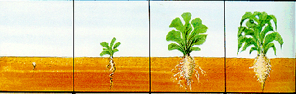 Het eerste jaar groeit de witlof buiten op het land bij ons. In het voorjaar worden de hele kleine zaadjes gezaaid. Dat zaadje groeit uit tot een plant met een lange wortel (ook wel "pen" genoemd) en groene bladeren. Die groene bladeren vinden wij niet lekker. Wat we dat eerste jaar willen hebben, is de wortel.