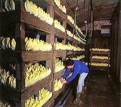 Als de wortelen uit de koeling worden gehaald, begint het tweede jaar van de witlofplant. De pennen worden in grote houten bakken met hun voetjes in het water gezet in een donkere ruimte. Er beginnen weer bladeren aan de wortel te groeien, maar omdat het donker is, blijven de bladeren wit en blijven ze dicht op elkaar zitten. |